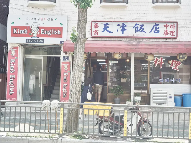 가게 앞에 도착하자마자 눈에 띈 건, 세월이 느껴지는 간판! 낡았지만 어딘가 모르게 정겨운 느낌이랄까? 딱 봐도 ‘오래된 맛집’의 향기가 폴폴 풍겨왔다. 게다가 바로 옆에는 킴스 잉글리쉬… 묘하게 이질적인 조합인데, 이것 또한 노포의 매력 아니겠어? ㅋㅋㅋ 왠지 초등학생 때 먹던 짜장면 맛이 떠오르는 그런 기분이었다.