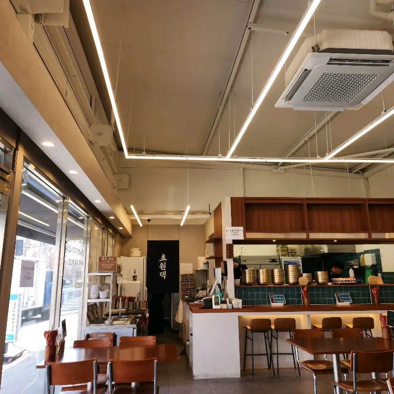 매장에 들어서자마자 깔끔하고 넓은 공간이 눈에 확 들어왔다. 테이블 간 간격도 넉넉해서 편안하게 식사를 즐길 수 있는 분위기! 특히 인상적이었던 건 천장에 길게 뻗은 LED 조명이었다. 은은하게 빛나는 조명이 가게 전체를 환하게 비추면서도, 과하지 않은 따뜻한 분위기를 연출하는 게 진짜 센스 있더라. 마치 카페에 온 듯한 아늑함이 느껴졌다고 해야 할까? 이런 분위기라면 데이트 코스로도 손색없을 듯!