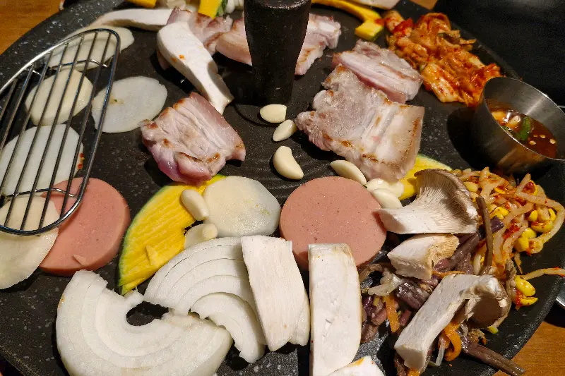 이곳의 또 다른 매력은, 바로 푸짐한 샐러드바입니다. 다양한 쌈 채소는 물론, 버섯, 콩나물, 김치 등 구워 먹기 좋은 재료들이 가득했습니다. 특히 신선한 야채를 마음껏 가져다 먹을 수 있다는 점이 좋았습니다. 저는 쌈 채소와 버섯을 듬뿍 가져와, 삼겹살과 함께 쉴 새 없이 쌈을 싸 먹었습니다.