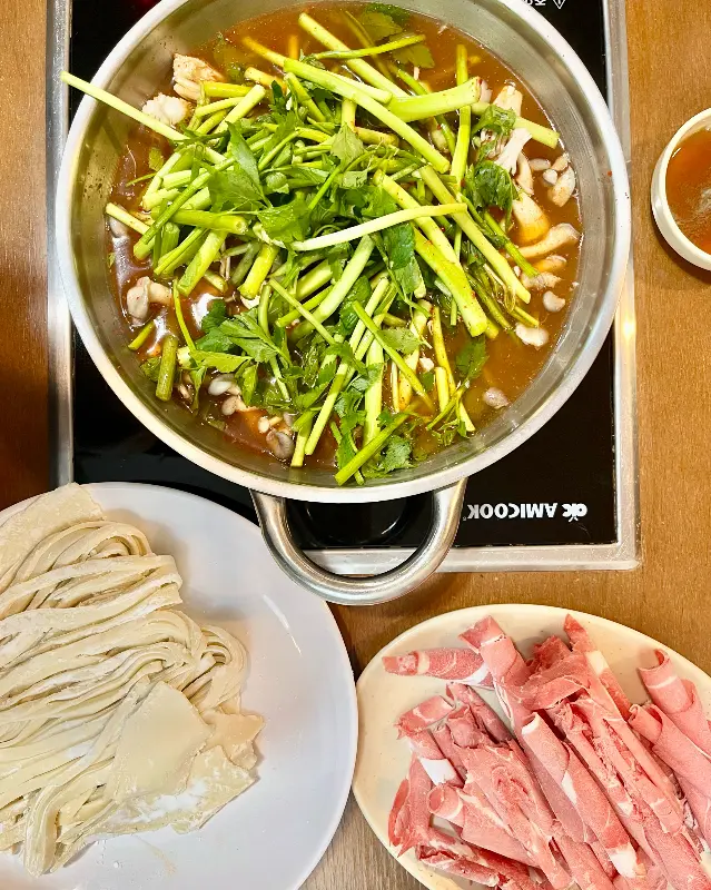 고기를 어느 정도 먹고 나니, 칼국수 면이 나왔습니다. 뽀얀 면발이 어찌나 탱글탱글해 보이는지, 얼른 육수에 넣고 싶어 혼났습니다. 면을 넣고 보글보글 끓으니, 칼칼한 국물이 면에 쏙 배어들어 정말 환상적인 맛이었어요. 면발도 어찌나 쫄깃한지, 후루룩후루룩 계속 입으로 들어가는 거 있죠. 옛날 엄마가 집에서 직접 밀어주시던 그 칼국수 맛이랑 똑같았습니다.