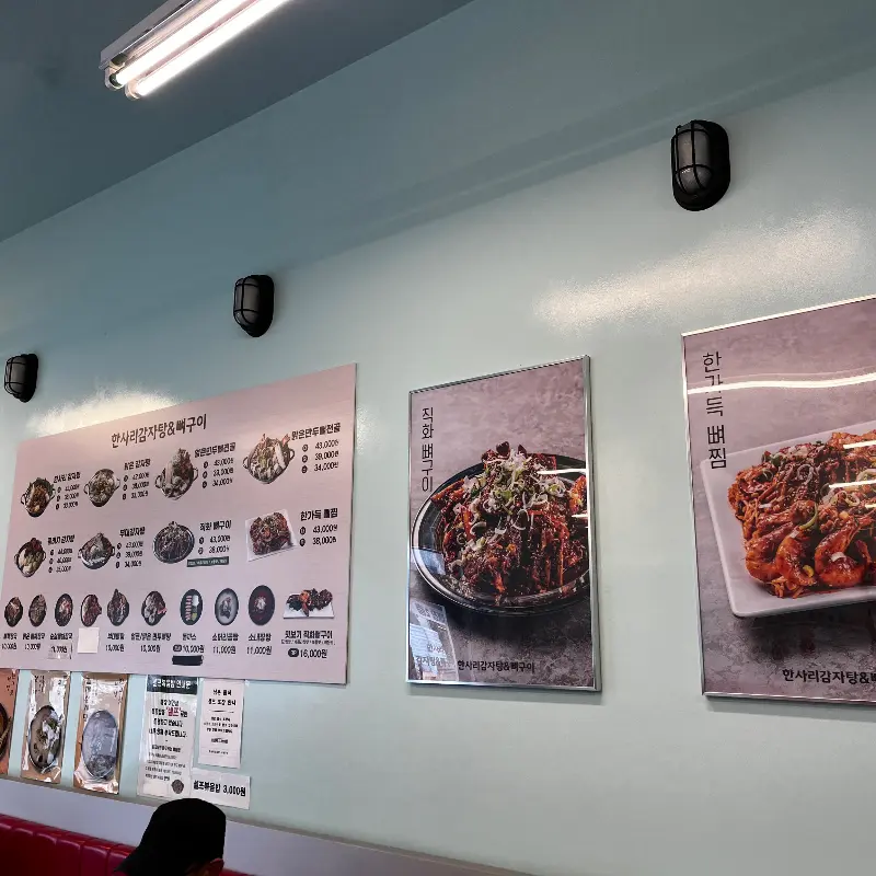가게 앞에 도착하니, 생각보다 훨씬 크고 깔끔한 외관이 눈에 띄었어. “한사리 감자탕”이라는 간판이 큼지막하게 붙어있는데, 왠지 모르게 맛집 포스가 느껴지는 거 있지. 문을 열고 들어서니 넓고 쾌적한 공간이 펼쳐졌어. 테이블 간 간격도 넉넉해서 편안하게 식사할 수 있겠더라. 은은한 조명 덕분에 분위기도 아늑하고, 벽에 걸린 음식 사진들을 보니 더욱 식욕이 당겼어.