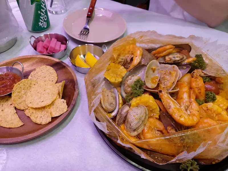 잠시 후, 기다리고 기다리던 봉지해물찜이 테이블 위에 놓였다. 마치 보물 상자를 연 듯, 투명한 봉지 안에는 먹음직스러운 해산물들이 가득 담겨 있었다. 새우, 홍합, 조개, 옥수수, 감자 등이 매콤한 양념에 버무려져, 보기만 해도 군침이 절로 돌았다. 봉지해물찜을 담은 검은 쟁반과 그 안의 내용물이 대비를 이루며 시각적인 즐거움을 더했다. 싱그러운 파슬리가 흩뿌려져 있어, 요리의 풍미를 한층 끌어올리는 듯했다.