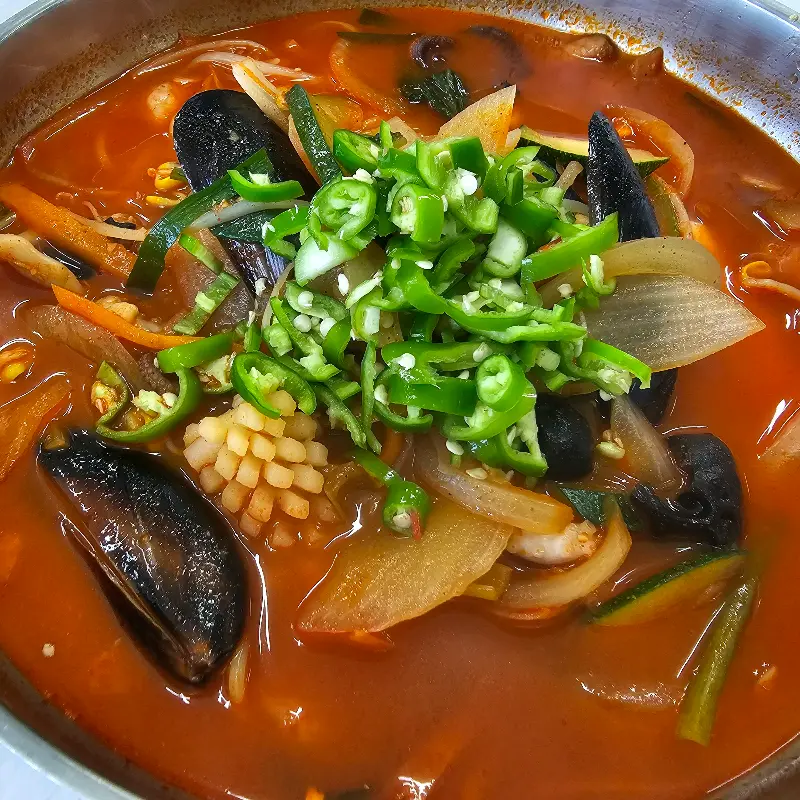 주문 후 얼마 지나지 않아, 드디어 기다리고 기다리던 해물 짬뽕이 테이블 위에 놓였다. 붉은 빛깔의 국물 위로 싱싱한 해산물이 가득 올려져 있는 모습은 그야말로 장관이었다. 홍합, 오징어, 새우, 낙지 등 다양한 해산물이 아낌없이 들어가 있었고, 콩나물과 야채도 푸짐하게 담겨 있었다.