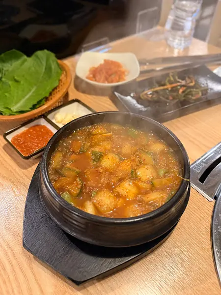 보니까 다른 테이블에서는 삼겹살 굽는 모습이 보이네. 역시 삼겹살은 진리! 는 뭔가 잔치 분위기인데? 우동이랑 튀김, 돈까스까지 풀코스로 즐기고 있구만. 는 밑반찬 클로즈업 샷! 샐러드, 해초, 콩나물 등등… 건강한 반찬들이 눈에 띄네. 은 불고기인가? 양파랑 같이 볶아 먹으면 완전 꿀맛일 듯! 은 떡볶이랑 김밥, 어묵탕 조합! 분식 러버들 취향 제대로 저격하겠는데? 은 양념치킨 비주얼! 닭튀김에 파릇파릇한 아스파라거스 조합, 신선한데? 는 뚝배기에 담긴 찌개! 뜨끈하게 밥 말아 먹으면 속이 확 풀릴 것 같아. 은 또 다른 찌개 비주얼! 파가 듬뿍 들어간 게 특징이네.