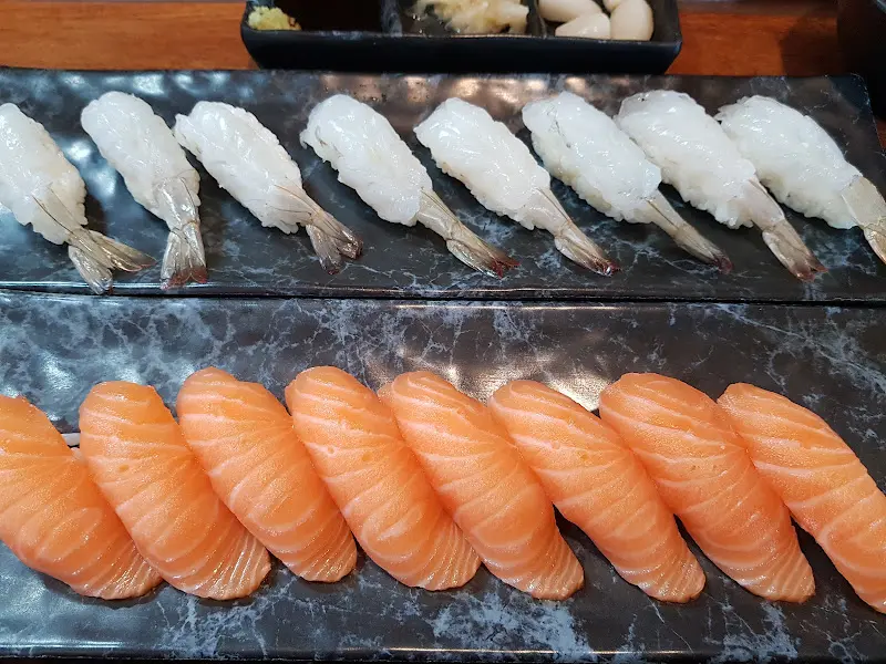 윤기가 흐르는 신선한 생새우와 연어의 모습은 보기만 해도 군침이 돌았습니다. 특히 연어초밥 위에 올려진 연어의 주황빛 색감은 어찌나 선명하던지요. 밥알 하나하나가 살아있는 듯한 밥 위에 두툼하게 썰린 생선이 얹혀진 모습은, 숙련된 장인의 솜씨를 엿볼 수 있게 했습니다.