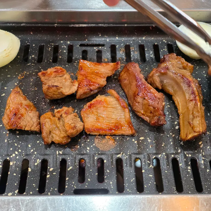 드디어 기다리고 기다리던 초벌 돼지갈비가 등장했다. 윤기가 자르르 흐르는 갈비의 모습은 보는 것만으로도 식욕을 자극했다. 이미 한 번 구워져 나온 덕분에, 테이블 위에서 살짝만 더 익혀 먹으면 되었다. 뜨겁게 달궈진 불판 위에 갈비를 올리자, 지글거리는 소리와 함께 맛있는 냄새가 코를 찔렀다.