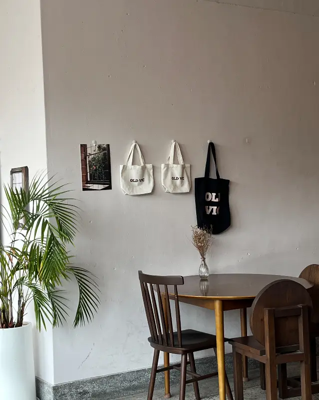 카페 내부는 아늑하고 따뜻한 분위기로 가득했다. 빈티지한 가구들과 은은한 조명이 편안함을 더했고, 창밖으로 보이는 전주의 풍경은 마음을 차분하게 만들어주었다. 특히 눈에 띄는 건 벽에 걸린 흑백 사진과 ‘OLD VIC’ 로고가 새겨진 에코백이었다. 단순한 장식을 넘어, 이곳만의 정체성을 드러내는 듯했다.