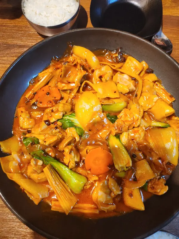 메뉴판을 펼쳐보니 찜닭 종류가 엄청 다양했다. 오리지널 찜닭은 물론, 로제찜닭, 마라로제찜닭, 섞어찜닭 등등… 결정 장애가 있는 나는 한참을 고민했다. 직원분께 추천을 부탁드리니, 요즘 제일 잘 나가는 메뉴는 마라로제찜닭이라고! 로제에 마라 조합이라니… 이건 무조건 먹어야 해!