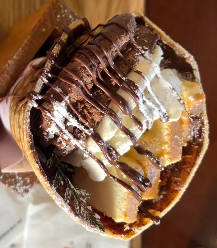 내가 시킨 두바이 크레페는 겉은 바삭하고 속은 촉촉한 크레페 안에 카다이프, 피스타치오 스프레드, 초코 아이스크림이 듬뿍 들어있었어. 한 입 딱 먹는 순간, 진짜 눈이 번쩍 뜨이는 맛! 카다이프의 바삭함이랑 피스타치오 스프레드의 달콤함, 그리고 초코 아이스크림의 시원함이 진짜 환상적인 조화를 이루더라. 에서 볼 수 있듯이 겉에 뿌려진 카다이프가 진짜 신의 한 수!