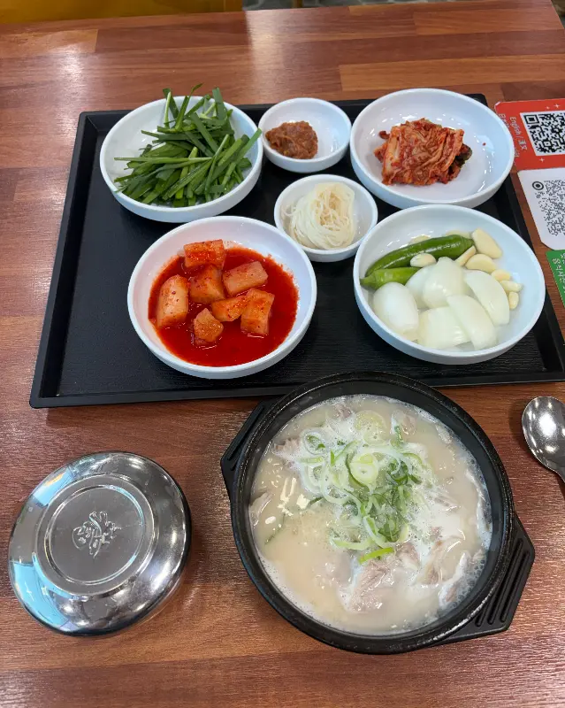 발길이 닿은 곳은 바로 ‘부산순대돼지국밥’ 집이었어. 간판부터가 왠지 모르게 정감이 갔지. 뽀얀 국물에 김이 모락모락 나는 국밥 사진이 어찌나 맛있어 보이던지. 문을 열고 들어서니, 역시나 사람들로 북적북적하더라. 혼자 온 손님들도 꽤 있어서, 나도 부담 없이 자리를 잡았어.