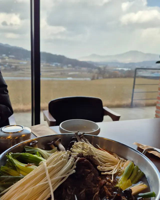 식당 문을 열고 들어서니, 생각보다 훨씬 넓고 깔끔한 공간이 펼쳐졌습니다. 은은한 조명 아래, 테이블 간 간격도 넉넉해서 편안하게 식사를 즐길 수 있겠다는 생각이 들었습니다. 통창으로 보이는 바깥 풍경은 또 얼마나 멋진지! 푸르른 산과 드넓은 들판이 한눈에 들어오는 게, 마치 그림을 보는 듯했습니다.