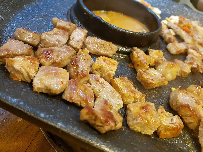 구워진 오겹살과 함께 제공되는 소스