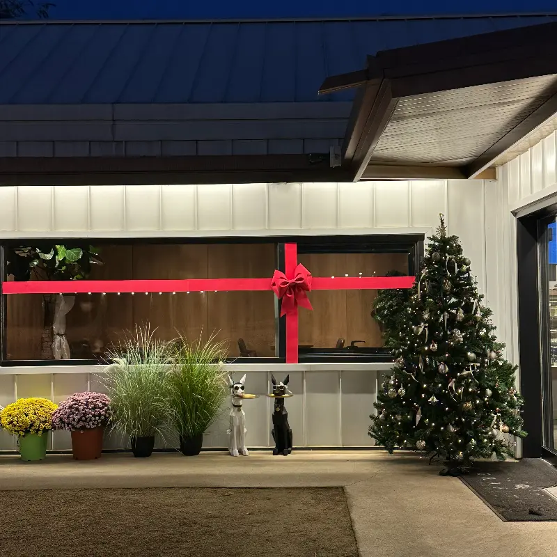 카페 입구부터가 예사롭지 않더라고. 마치 커다란 선물 상자처럼, 붉은 리본 장식이 창문에 큼지막하게 둘러져 있는 게 아니겠어? 크리스마스 분위기가 물씬 풍기는 게, 마음까지 따뜻해지는 기분이었어. 옆에는 반짝이는 전구로 장식된 크리스마스 트리가 떡하니 서 있는데, 아이들 데리고 온 가족 손님들이 사진 찍느라 정신없더라. 나도 질 수 없지! 얼른 사진 한 장 찍었어.