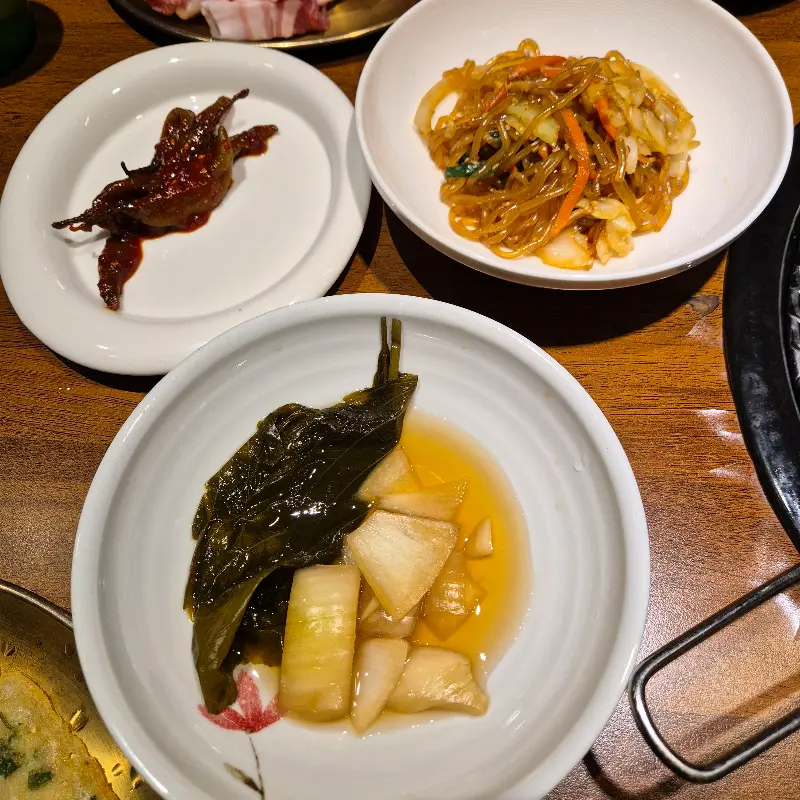 함께 제공된 멜젓에 찍어 먹으니, 짭짤하면서도 깊은 풍미가 삼겹살의 맛을 한층 더 끌어올렸다. 싱싱한 쌈 채소에 삼겹살과 겉절이를 함께 싸서 먹으니, 아삭한 식감과 매콤한 양념이 어우러져 입안 가득 풍성한 맛을 느낄 수 있었다. 쌈을 한 입 가득 넣고 음미할 때마다, 나는 마치 자연 속에서 신선한 공기를 마시는 듯한 상쾌함을 느꼈다.