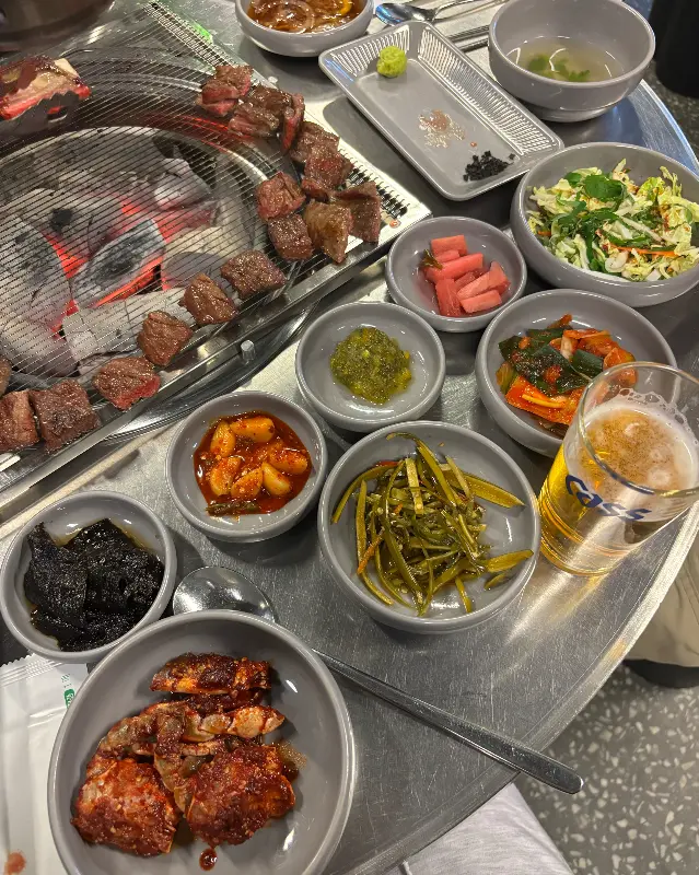 자리에 앉아 메뉴판을 펼쳐 들었다. 다양한 부위의 고기들이 눈길을 사로잡았지만, 오늘 나의 선택은 ‘우레 생갈비’였다. 이곳의 시그니처 메뉴라고 하니, 그 맛이 더욱 궁금해졌다. 잠시 후, 숯불이 들어오고, 곧이어 푸짐한 한 상이 차려졌다. 테이블 가득 놓인 다채로운 밑반찬들은 보기만 해도 마음을 풍족하게 했다.