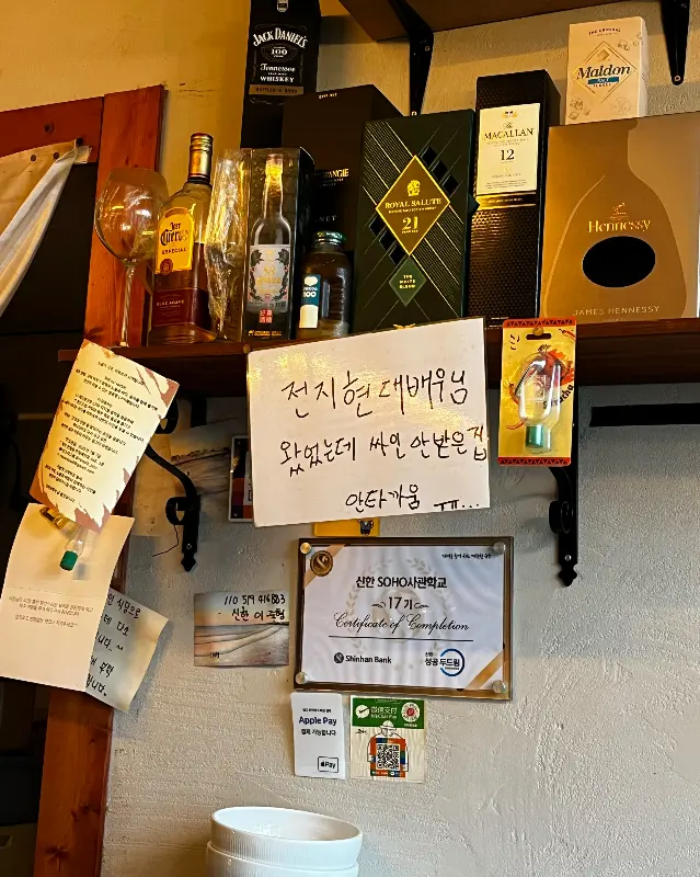 문을 열고 들어서니, 아담한 공간이 눈에 들어왔어. 테이블은 몇 개 없고, 바 테이블이 주를 이루는 그런 구조. 혼밥러들을 위한 최적의 장소인듯. 벽에는 손님들이 남긴 낙서와 사진들이 빼곡하게 붙어있고, 힙한 분위기를 더하는 소품들이 눈길을 사로잡았지. 을 보니 벽 한켠에 술병과 각종 소스, 인증서 등이 놓여있는게 사장님의 내공이 느껴진달까.