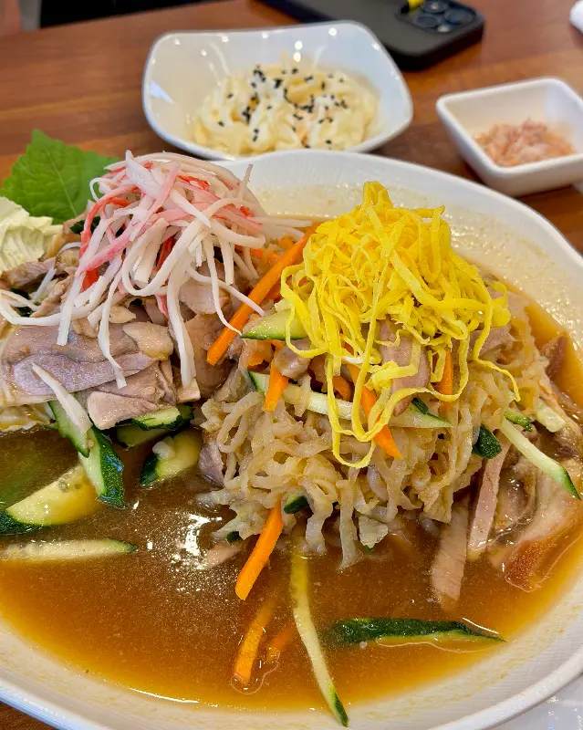냉채족발은 화려한 비주얼부터 시선을 사로잡았습니다. 얇게 썰린 족발 위로 채 썬 오이, 당근, 해파리냉채, 그리고 톡 쏘는 겨자 소스가 듬뿍 올려져 있었죠. 한 입 맛보니 코끝을 찡하게 울리는 겨자 향과 아삭아삭한 채소의 식감이 환상적인 조화를 이루었습니다. 족발 자체도 잡내 없이 쫄깃하고 부드러워서, 왜 이곳이 냉채족발의 원조라고 불리는지 단번에 알 수 있었습니다. 가격은 중 사이즈 기준으로 35,000원입니다.