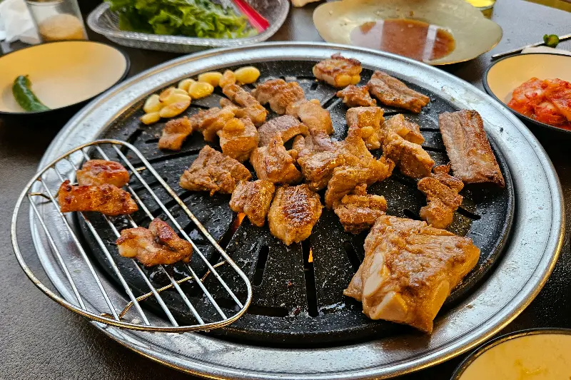 숯불이 딱 들어오는데, 와… 화력이 장난 아니더라. 테이블마다 설치된 환풍구 덕분에 연기는 순식간에 사라지고, 숯불 향만 은은하게 남는 게 아주 맘에 들었어. 고기 굽기 전에 감자부터 올려주는 센스! 뜨거운 불판 위에서 감자가 노릇노릇 익어가는 모습, 보기만 해도 군침이 싹 도는 거 있지?