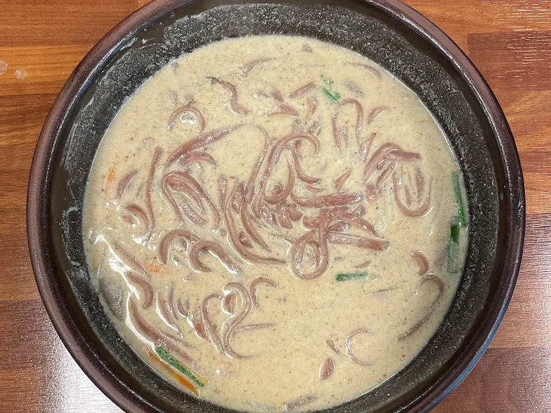 젓가락으로 면을 휘저어 한 입 가득 먹어봤다. 맙소사… 이거 진짜 미쳤다! 면발은 어찌나 쫄깃한지, 입안에서 탱글탱글 춤을 추는 것 같았다. 들깨 국물은 고소하면서도 담백하고, 홍미의 은은한 단맛이 더해져 환상의 조화를 이루었다. 진짜, 먹는 내내 감탄사 연발!