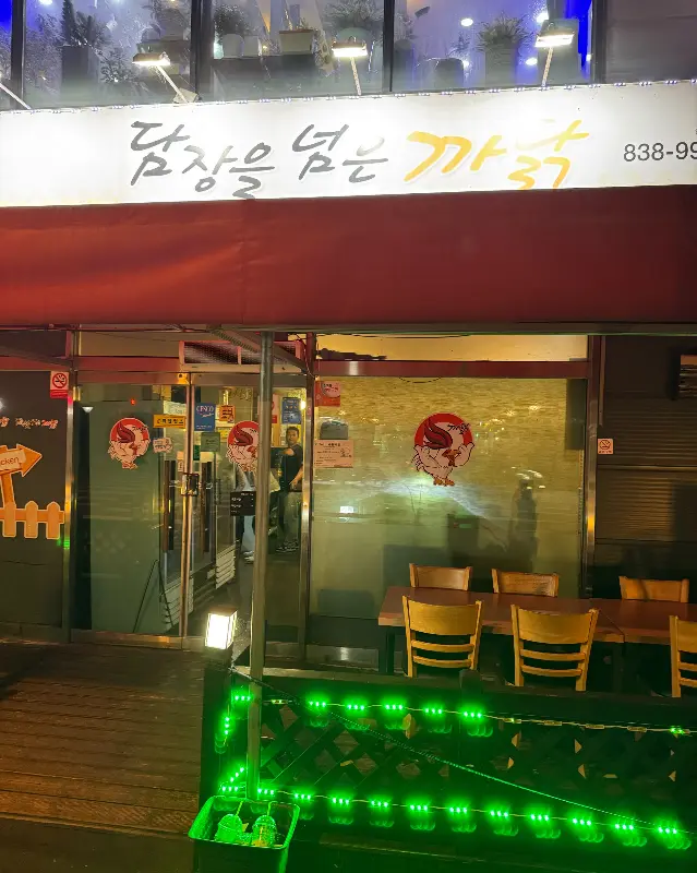 저녁 7시, 드디어 ‘담장을 넘은 까닭’에 도착했어. 간판부터 범상치 않네. 초록색 네온사인이 힙하게 반겨주는 이 곳. 문을 열자마자 풍기는 치킨 냄새, 뱃속에서 랩 배틀이 시작됐어. 빨리 먹고 싶다고 아우성치는 내 위장, 진정시키느라 혼났지.