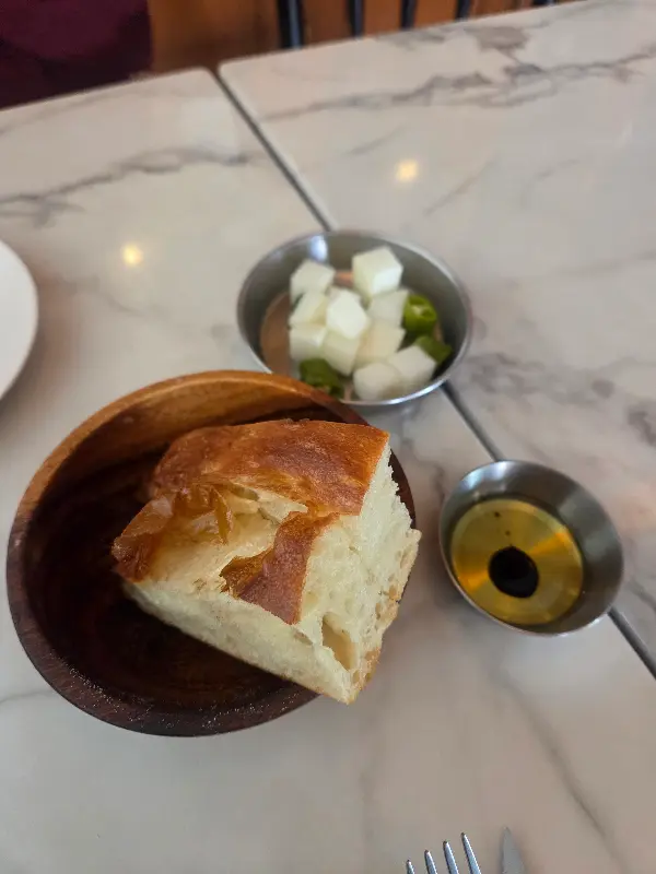 제일 먼저 식전빵이 나왔는데, 이야, 빵 냄새부터가 남다르더라. 겉은 바삭하고 속은 촉촉한 포카치아였는데, 어찌나 맛있던지. 빵만 먹어도 ‘아, 여기는 찐이구나’ 하는 생각이 들더라니까. 올리브 오일에 콕 찍어 먹으니, 입안에서 풍미가 팡팡 터지는 게, 순식간에 빵 한 조각을 해치웠지 뭐야.