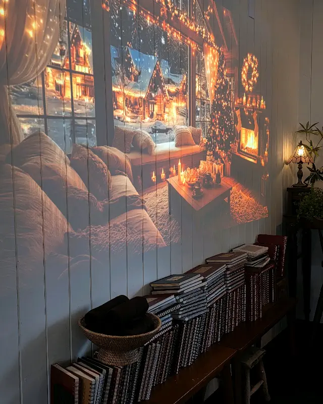 크리스마스를 맞이하여 특별하게 꾸며진 인테리어가 시선을 사로잡았다. 와 에서 보이는 것처럼, 붉은색과 금색 장식으로 화려하게 장식된 트리가 카페 한 켠을 빛내고 있었다. 앙증맞은 곰 인형과 반짝이는 오너먼트들이 어린 시절의 설렘을 되살리는 듯했다. 벽면에 비춰지는 따뜻한 영상 덕분에 마치 눈 덮인 산장에 와 있는 듯한 착각마저 들었다.