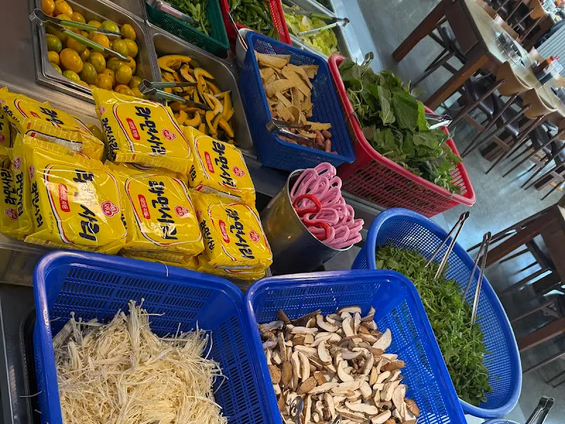 자리에 앉자마자 샐러드바로 향했다. 뷔페식으로 운영되는 샐러드바에는 신선한 야채와 다양한 반찬들이 가득했다. 배추, 청경채, 숙주, 버섯 등 샤브샤브에 넣어 먹으면 맛있는 야채들이 보기 좋게 정돈되어 있었다. 사진에서 보았던 것처럼 형형색색의 채소들이 싱싱함을 뽐내고 있었다. 특히, 노란색 포장지에 담긴 사리가 눈에 띄었는데, 쫄깃한 식감이 기대되는 비주얼이었다. 샐러드바 한켠에는 샤브샤브에 곁들여 먹을 수 있는 샐러드, 김치, 피클 등 다양한 반찬들도 준비되어 있었다.