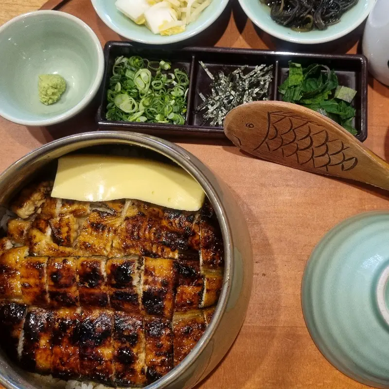 히츠마부시(반마리): 38,000원. 옻칠이 된 듯한 검푸른 빛깔의 묵직한 도자기 덮밥 그릇을 열자, 윤기가 좌르르 흐르는 장어들이 밥 위에 촘촘히 올려져 있었다. 겉은 바삭하고 속은 촉촉한 완벽한 굽기, 그리고 코를 찌르는 은은한 숯불 향! 장어 위에는 일본식 계란말이인 듯한 네모난 교꾸 한 조각이 앙증맞게 올려져 있었다. 젓가락으로 장어를 살짝 들어보니, 생각보다 두툼하고 큼지막했다.