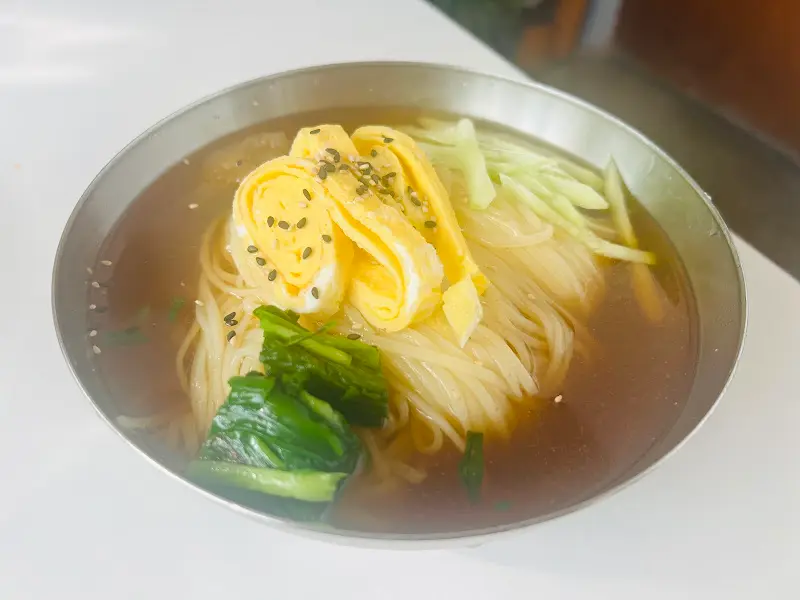 드디어 냉우동이 눈앞에 나타났다. 스테인리스 그릇에 담긴 냉우동은 시각적으로도 완벽한 조화를 이루고 있었다. 뽀얀 면 위로 가지런히 놓인 노란 계란 지단, 싱그러운 오이채, 그리고 초록색 채소는 색감의 대비를 통해 식욕을 자극했다. 면발은 중화제를 사용하지 않아 인위적인 쫄깃함 대신, 자연스러운 찰기를 머금고 있었다. 마치 잘 숙성된 반죽처럼, 면 자체의 질감이 살아있는 듯했다.