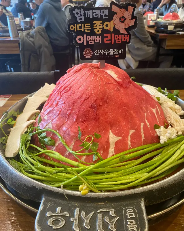 가게 앞에 도착하니, 역시나 많은 사람들로 북적였다. 다행히 웨이팅이 길지 않아 곧 자리를 안내받을 수 있었다. 깔끔하게 정돈된 테이블과 활기찬 분위기가 기대감을 한층 더 고조시켰다. 메뉴판을 펼쳐 들여다보니, 물갈비뿐만 아니라 불고기, 샤브샤브 등 다양한 메뉴가 눈에 띄었다. 하지만 첫 방문이었기에, 대표 메뉴인 ‘산더미 물갈비’를 주문하기로 결정했다.