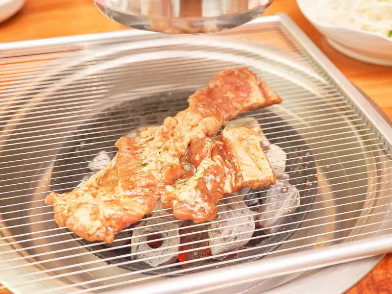 드디어 주인공 등장! 땟깔부터 남다른 돼지갈비, 고추냉이 양념 옷을 입고 자태를 뽐내. 불판 위에 촤르르 올려 구워지는 소리, ASMR이 따로 없네. 연기 속으로 사라지는 나의 근심, 이 순간만큼은 나 완전 딴 세상.