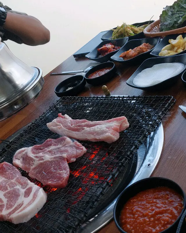고민 끝에 목살 2인분과 삼겹살 1인분, 그리고 된장찌개(중간맛)를 주문했다. 잠시 후, 숯불이 들어오고 테이블이 순식간에 푸짐하게 차려졌다. 밑반찬으로는 겉절이 김치, 깻잎 장아찌, 콩나물무침, 무생채 등 정갈한 반찬들이 나왔는데, 하나하나 맛깔스러워 보였다. 특히 숯불 위에 올려진 뭉텅한 목살의 자태는 감탄을 자아냈다.