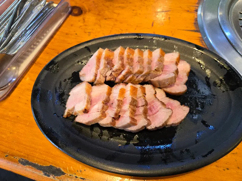 드디어 기다리고 기다리던 초벌 돼지고기가 등장했다. 윤기가 자르르 흐르는 돼지고기는 먹기 좋게 썰어져 나왔고, 겉은 노릇하게 익어있어 시각적으로도 훌륭했다. 초벌 과정을 거쳐 기름기는 쏙 빠지고, 육즙은 그대로 살아있는 듯했다. 불판 위에 고기를 올리자, 지글거리는 소리와 함께 고소한 향이 코를 자극했다.