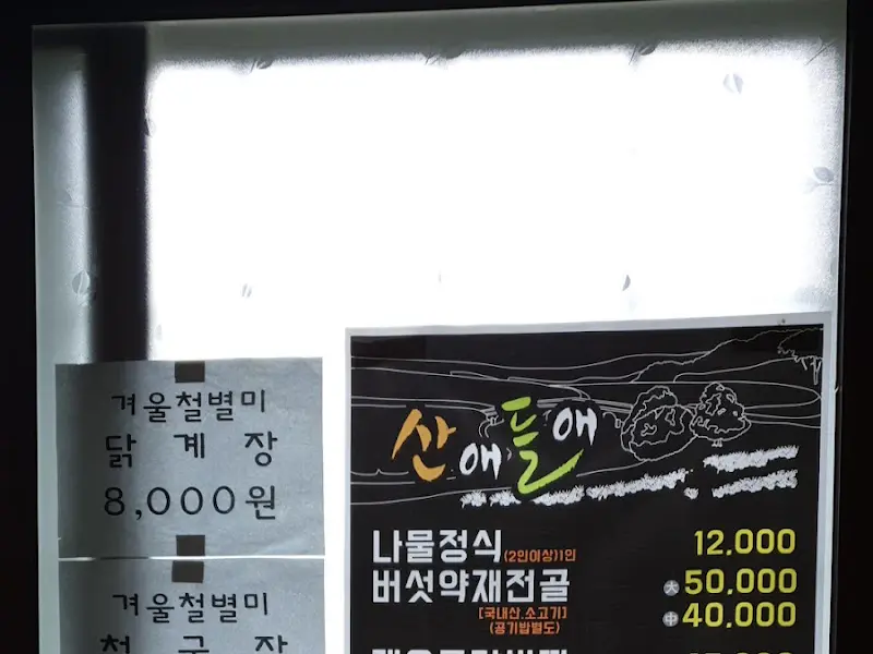 산애들애의 메뉴는 하나하나가 자연을 담은 듯 정갈했습니다. 특히 제 눈길을 사로잡은 메뉴는 돌솥비빔밥, 버섯전골, 그리고 해물찜이었어요. 이 세 가지 메뉴는 산애들애의 대표 메뉴라고 할 수 있죠. 저는 고민 끝에 돌솥비빔밥과 버섯전골을 선택했습니다.