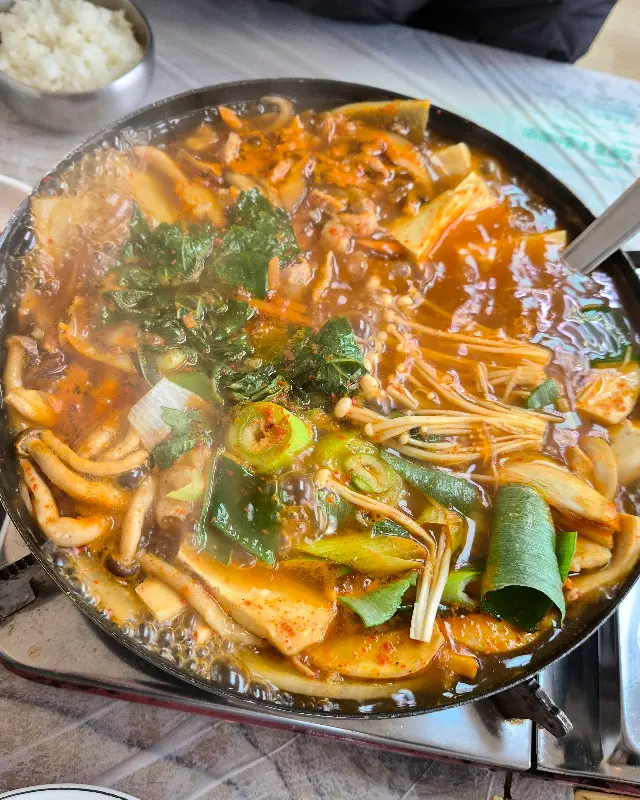 드디어 기다리고 기다리던 버섯전골이 나왔다. 커다란 냄비 가득 담긴 버섯전골의 푸짐한 양에 입이 떡 벌어졌다. 팽이버섯, 느타리버섯, 새송이버섯 등 다양한 종류의 버섯이 듬뿍 들어 있었고, 쑥갓과 깻잎 등 신선한 채소도 아낌없이 들어가 있었다. 붉은 빛깔의 국물은 보기만 해도 얼큰함이 느껴졌다. 냄새 또한 예술이었다. 버섯 특유의 향긋함과 매콤한 양념 냄새가 코를 자극하며 식욕을 돋우었다.