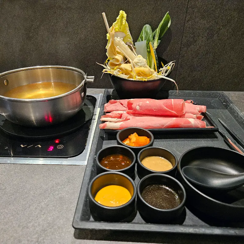 개인 트레이에 정갈하게 담긴 샤브샤브 재료와 다양한 소스