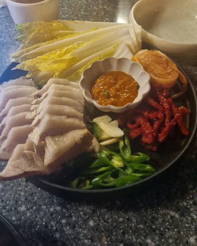 잠시 후, 기본 안주가 나왔다. 삶은 알배추에 쌈장, 그리고 따뜻한 두부였다. 겉으로는 평범해 보이지만, 이 안주에는 숨겨진 과학적 비밀이 있었다. 알배추의 은은한 단맛과 쌈장의 발효된 감칠맛, 그리고 두부의 고소함이 완벽한 조화를 이루며 입맛을 돋우는 역할을 했다. 특히, 알배추에 함유된 글루코시놀레이트는 소화를 돕고, 위장 건강에도 도움을 준다.