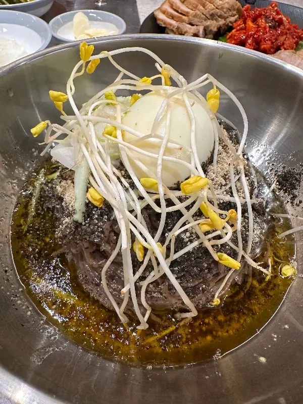 드디어 기다리고 기다리던 메밀막국수가 나왔다. 스테인리스 그릇에 담겨 나온 막국수는, 보기만 해도 시원함이 느껴졌다. 면 위에는 김가루와 들깨가루가 듬뿍 뿌려져 있었고, 톡톡 터질 듯한 노란 새싹이 싱그러움을 더했다. 살얼음이 동동 떠 있는 육수는, 더위를 잊게 해 줄 만큼 시원해 보였다. 젓가락으로 면을 휘저어 육수와 함께 맛을 보니, 입안 가득 퍼지는 메밀의 향긋함이 일품이었다. 쫄깃한 면발은 탄력이 넘쳤고, 육수는 깊고 진한 맛을 자랑했다. 특히 들깨가루의 고소함은, 막국수의 풍미를 한층 더 끌어올렸다.
