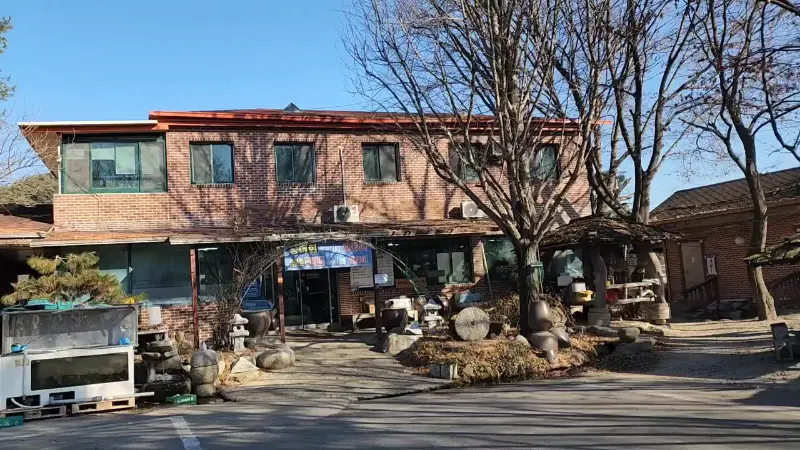 버스터미널에서 내려 조금 걸으니, 붉은 벽돌로 지어진 2층 건물이 눈에 들어왔다. 간판에는 큼지막하게 ‘도촌송어회’라고 쓰여 있었다. 주변 풍경과 어우러진 소박한 외관에서 오랜 시간 이 자리를 지켜온 듯한 느낌이 물씬 풍겼다. 마치 잘 관리된 실험실처럼 깔끔하게 정돈된 모습은 첫인상부터 신뢰감을 주었다. 식당 앞에는 옹기들이 줄지어 놓여있고, 작은 정원처럼 꾸며진 공간이 정겨움을 더했다.