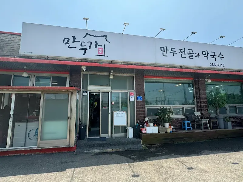 만두가에 도착했을 때, 가장 먼저 눈에 들어온 것은 정갈한 외관이었다. 붉은 벽돌과 넓은 창이 조화롭게 어우러진 모습이 편안함을 주었다. 커다란 간판에는 ‘만두가’라는 정갈한 글씨와 함께 ‘만두전골과 막국수’라는 메뉴가 적혀 있었다. 외관에서 느껴지는 깔끔함이 음식에 대한 기대를 한층 높였다. 에서 보듯이, 주변은 한적하고 조용한 분위기였다.