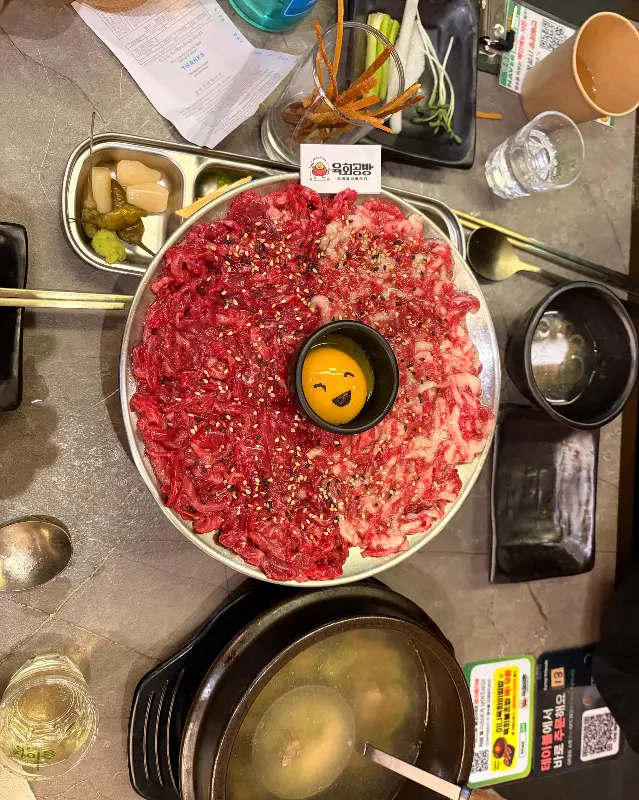 퇴근 후, 왠지 모르게 신선한 육회가 간절하게 당기는 날이었다. 마치 자석에 이끌리듯, 나는 청주 강서동에 위치한 “육회공방”으로 발걸음을 향했다. 이곳은 이미 청주 맛집으로 명성이 자자한 곳. 며칠 전부터 벼르던 참이라, 설레는 마음을 감출 수 없었다. 문을 열고 들어서는 순간, 활기찬 분위기와 맛있는 음식 냄새가 코를 자극하며 기대감을 한껏 끌어올렸다.