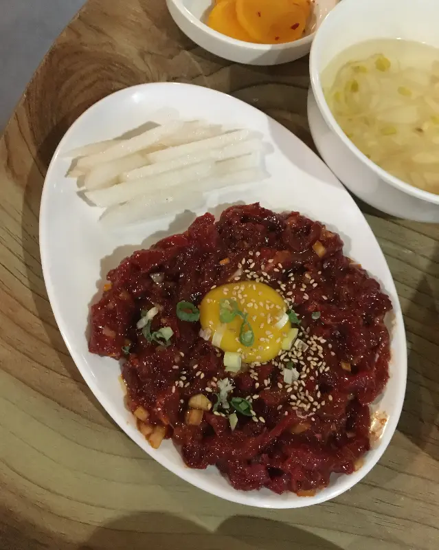 곁들여 나온 맑은 콩나물국은 매운맛을 중화시켜주는 역할을 톡톡히 했다. 시원하고 깔끔한 국물은 입안을 개운하게 만들어, 다시 매운갈비찜을 즐길 준비를 시켜주었다. 기본으로 제공되는 육회는 신선함이 눈으로도 느껴질 정도였다. 윤기가 자르르 흐르는 육회 위에 뿌려진 깨와 쪽파는 시각적인 즐거움까지 더했다. 노른자를 톡 터뜨려 육회와 함께 먹으니, 고소함이 배가 되어 입 안에서 황홀한 맛의 향연이 펼쳐졌다.