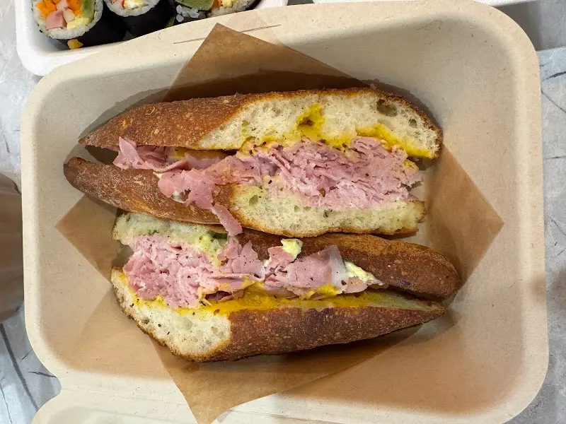 또 다른 사진 속 잠봉뵈르는 바삭한 바게트 빵 사이에 햄과 버터가 듬뿍 들어간 모습이다. 빵은 황금빛 갈색을 띠고 있으며, 햄은 얇게 슬라이스되어 겹겹이 쌓여 있다. 버터는 빵과 햄 사이에서 녹아내려 윤기를 더하고 있다. 한 입 베어 물면 바삭한 빵과 짭짤한 햄, 그리고 고소한 버터의 풍미가 입안 가득 퍼질 것 같다.