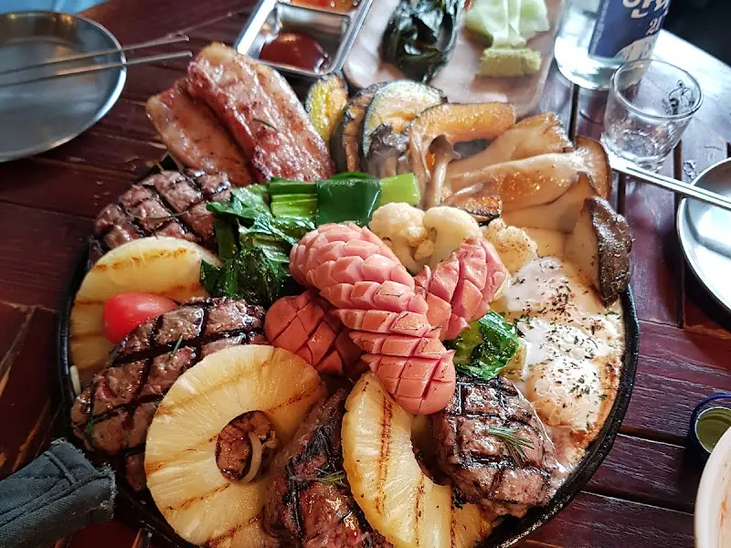 윤기가 자르르 흐르는 훈제 통삼겹살과, 겉은 바삭하고 속은 촉촉한 채끝살 스테이크가 먹음직스러운 자태를 뽐냈다. 구운 파인애플, 버섯, 소세지, 청양고추, 마늘, 숙주볶음 등 다채로운 가니쉬가 함께 어우러져 풍성함을 더했다. 마치 팔레트 위의 색깔처럼, 형형색색의 재료들이 조화롭게 놓여있는 모습이 인상적이었다.
