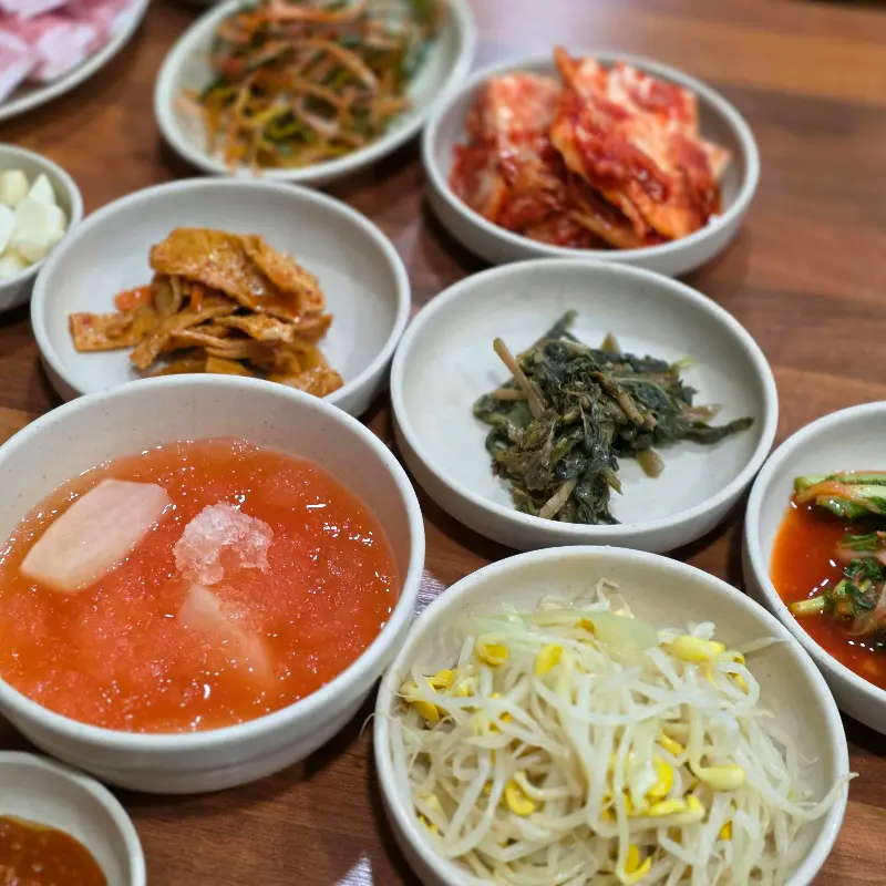 가게 안은 이미 저녁 식사를 즐기려는 사람들로 북적였다. 테이블마다 놓인 불판 위에서는 삼겹살이 지글거리는 소리와 함께 고소한 냄새가 코를 자극했다. 정겹게 “어서 오세요!” 외치는 직원들의 목소리가 활기를 더했다. 잠시 기다린 후, 자리에 앉자마자 빠르게 기본 찬들이 차려졌다. 쟁반 가득 담겨 나오는 푸짐한 인심에 미소가 절로 지어졌다.