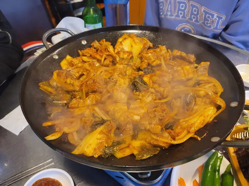 메뉴는 단 하나, 돼지김치구이. 2인분부터 주문이 가능하다는 말에, 망설임 없이 2인분을 주문했습니다. 잠시 후, 커다란 둥근 철판에 푸짐하게 담긴 돼지김치구이가 눈 앞에 놓였습니다. 큼지막하게 썰린 돼지고기와 잘 익은 김치, 양파가 듬뿍 들어간 모습이었습니다. 테이블에 놓인 버너에 불을 켜자, 지글거리는 소리와 함께 매콤한 향기가 식욕을 자극했습니다.