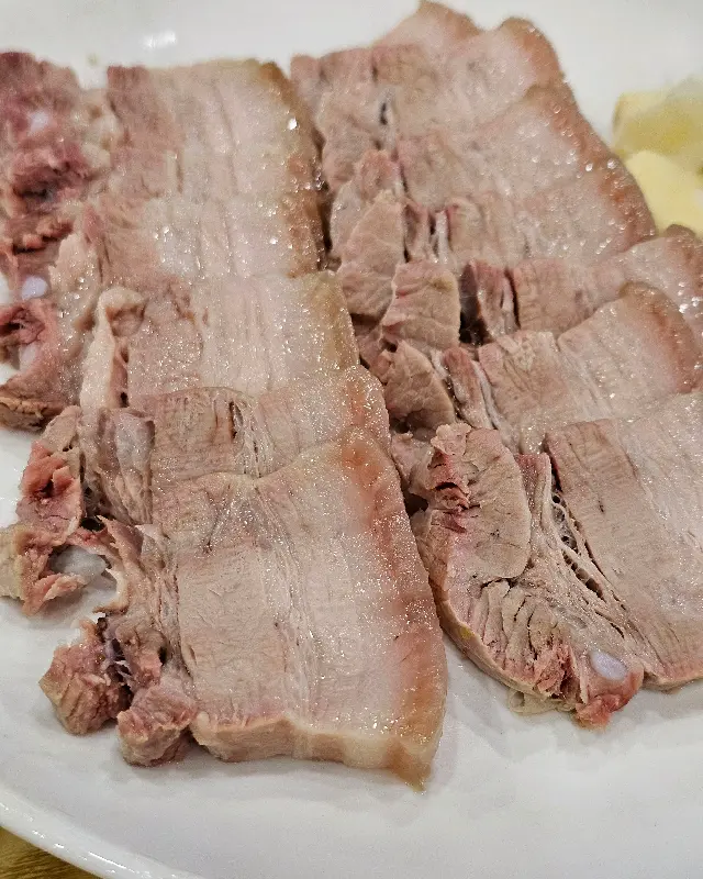 사진에서도 보이듯이, 수육은 얇게 썰어져 나오기 때문에 쌈으로 먹기에 아주 좋습니다. 알배추에 수육 한 점, 고추장 양념, 그리고 대파를 듬뿍 올려 한 입 가득 넣으면 그야말로 행복이 밀려오는 맛입니다. 다만, 아쉬운 점은 가격 대비 양이 조금 적다는 것입니다. 둘이서 수육 소자를 시키면 칼국수와 함께 먹어도 약간 부족하게 느껴질 수 있습니다.