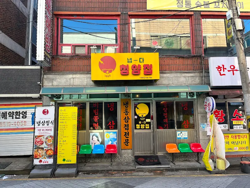 영등포구청역에서 멀지 않은 곳에 위치한 냅다청양집은, 멀리서도 한눈에 알아볼 수 있을 만큼 정겨운 외관을 자랑하고 있었다. 노란색 간판에 큼지막하게 쓰인 “냅다 청양집”이라는 글자가 어쩐지 친근하게 느껴졌다. 마치 80년대 영화 세트장 같은 느낌이랄까? 가게 앞에 놓인 알록달록한 플라스틱 의자들은 잠시 잊고 지냈던 어린 시절의 향수를 불러일으켰다.