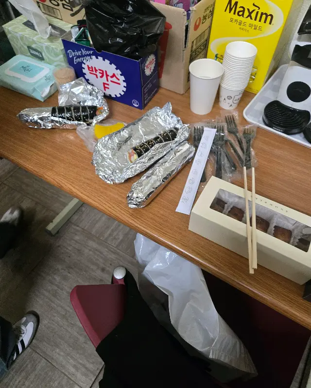 을 다시 보니, 포장된 김밥과 함께 놓여있는 젓가락, 컵, 휴지 등이 눈에 띄네. 마치 소풍을 떠나는 듯한 설렘이 느껴지는 구성이야. 김밥을 포장해서 공원이나 한강변에서 먹으면 더욱 맛있을 것 같아. Yo, Let’s get it! 다음에는 꼭 김밥 들고 피크닉 가야지!
