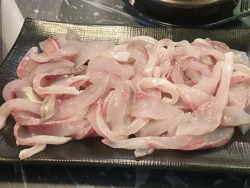드디어 기다리고 기다리던 오징어회가 나왔다. 사진에서 보이는 것처럼, 윤기가 좌르르 흐르는 뽀얀 오징어 살결이 어찌나 먹음직스럽던지! 칼질도 어찌나 섬세하게 하셨는지, 마치 꽃잎처럼 얇게 썰린 오징어회가 접시 위에 소복하게 쌓여있다.